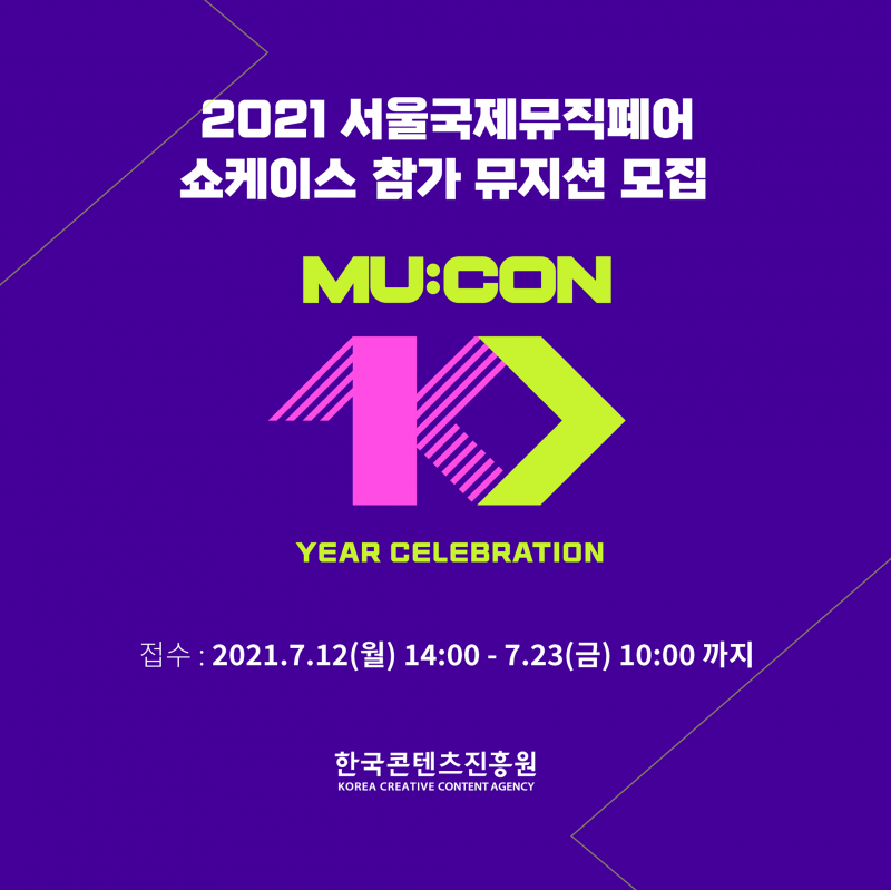 문화체육관광부와 한국콘텐츠진흥원은 오는 23일까지 '2021 서울국제뮤직페어(MU:CON·이하 뮤콘) 쇼케이스에 참가할 뮤지션을 모집한다고 15일 밝혔다. 올해 10주년을 맞이하는 뮤콘은 국내 음악콘텐츠 활성화와 국내 뮤지션의 해외 진출을 돕는 아시아 최대 규모 글로벌 뮤직마켓이다.